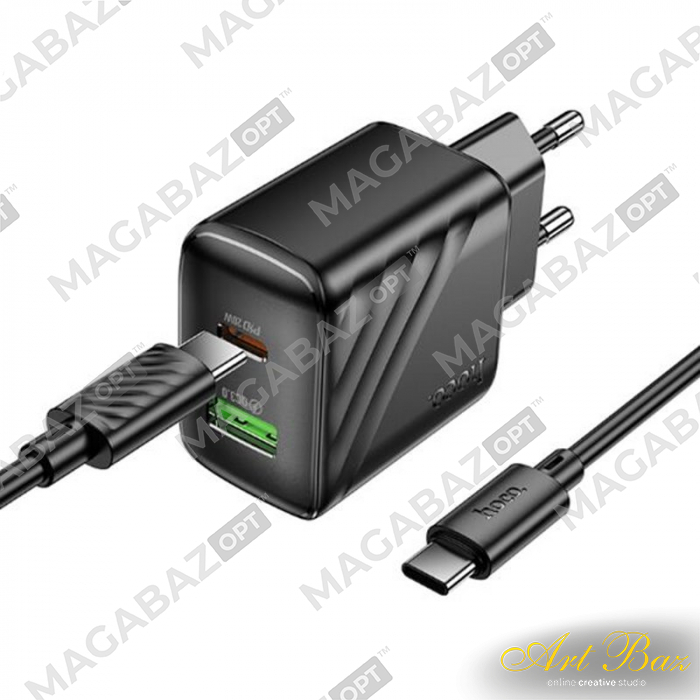 УЗУ блок-сеть выходы Type-C 3000 mA/USB 3000 mA + usb кабель Type-C на Type-C HOCO CS25A Rico 5V PD20W черный QC3.0